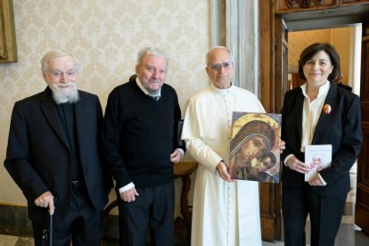 De izquierda a derecha, con el Papa: Mario Pezzi, Kiko Argüello y Ascensión Romero. Vatican Media