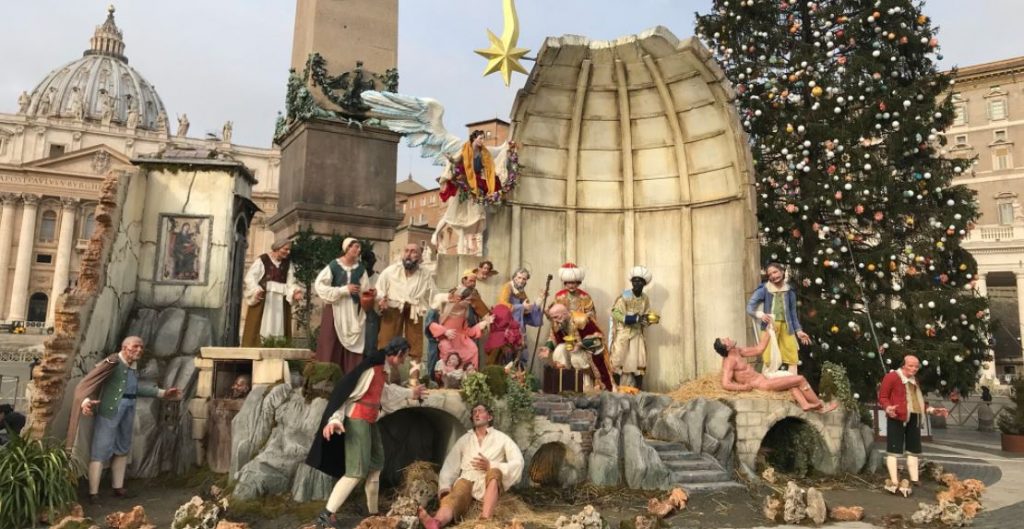 Este año el Belén colocado en la Plaza de san Pedro tiene un motivo particular. Busca recordar las obras de Misericordia, desde siempre esenciales al cristianismo, pues el mismo Jesucristo muestra su centralidad en la descripción que hace del Juicio Final según el evangelio de san Mateo. Pero, qué duda cabe, dichas prácticas han adquirido un protagonismo especial en la vida de la Iglesia durante el pontificado de Francisco, y el Nacimiento del Vaticano se hace eco de dicha preponderancia. Nadie pone en duda su calidad artística. Regalado por la abadía de Montevergine se ha realizado según el clásico estilo napolitano del siglo XVIII. Sin embargo, los críticos han observado que en medio del despliegue artístico y catequético, la escena central, es decir, el nacimiento de Jesús, se vuelve secundaria, adquiriendo protagonismo en cambio las obras de misericordia, en las cuales, a la postre, aparece un hombre desnudo. En efecto, la obra de misericordia “vestir al desnudo” se representa con un desnudo musculoso, que podría haber salido de un gym o competencia de físico-culturismo.